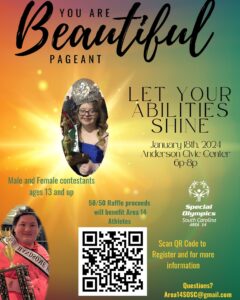 For more information, please visit the You Are Beautiful Special Needs Pageant Facebook page. You may also call Area-14 Special Olympic office, Co-Directors Kathy Schofield and Tessa Hilley at 864- 260-4142.