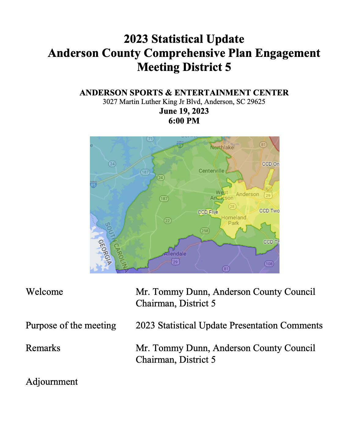 2023 Statistical Update Anderson County Comprehensive Plan Engagement Meeting for Council District 5 on June 19, 2023 at 6:00 PM. The meeting will be held at the Civic Center of Anderson, 3027 Martin Luther King Jr Blvd, Anderson, SC 29625.