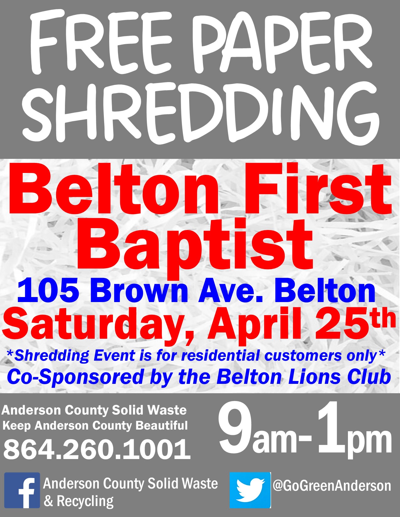 Join us for a FREE Paper Shredding Event on April 25th from 9:00 AM–1:00 PM in the First Baptist Church Belton parking lot. Safely dispose of sensitive documents and protect your personal information—quick, easy, and free!