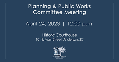 The Planning and Public Works Committee will meet on Monday, April 24, 2023, at 12:00 pm. Meeting will be held at the Historic Courthouse, 101 South Main Street, Anderson.