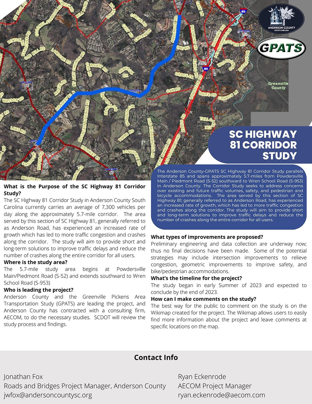 Anderson County and GPATS is conducting a study of the Highway 81 corridor from the Wren School Rd/Lake Rd intersection to the Powdersville Main/ Piedmont Rd intersection. Anderson County requests comments along this section of Highway 81. To make a comment, please visit the wiki map here: https://wikimapping.com/SC-Highway-81-Corridor-Study.html.