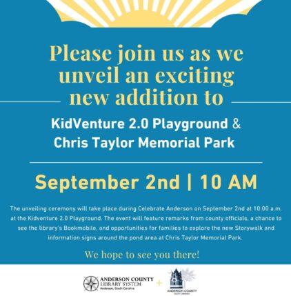 Join us for an exciting unveiling! In partnership with Anderson County Library System, we are adding a special Storywalk and fun, educational signs to KidVenture 2.0 Playground and Chris Taylor Memorial Park. Join us on September 2 at 10 AM at the KidVenture 2.0 Playground to see the new Storywalk, explore the Bookmobile, and hear… |